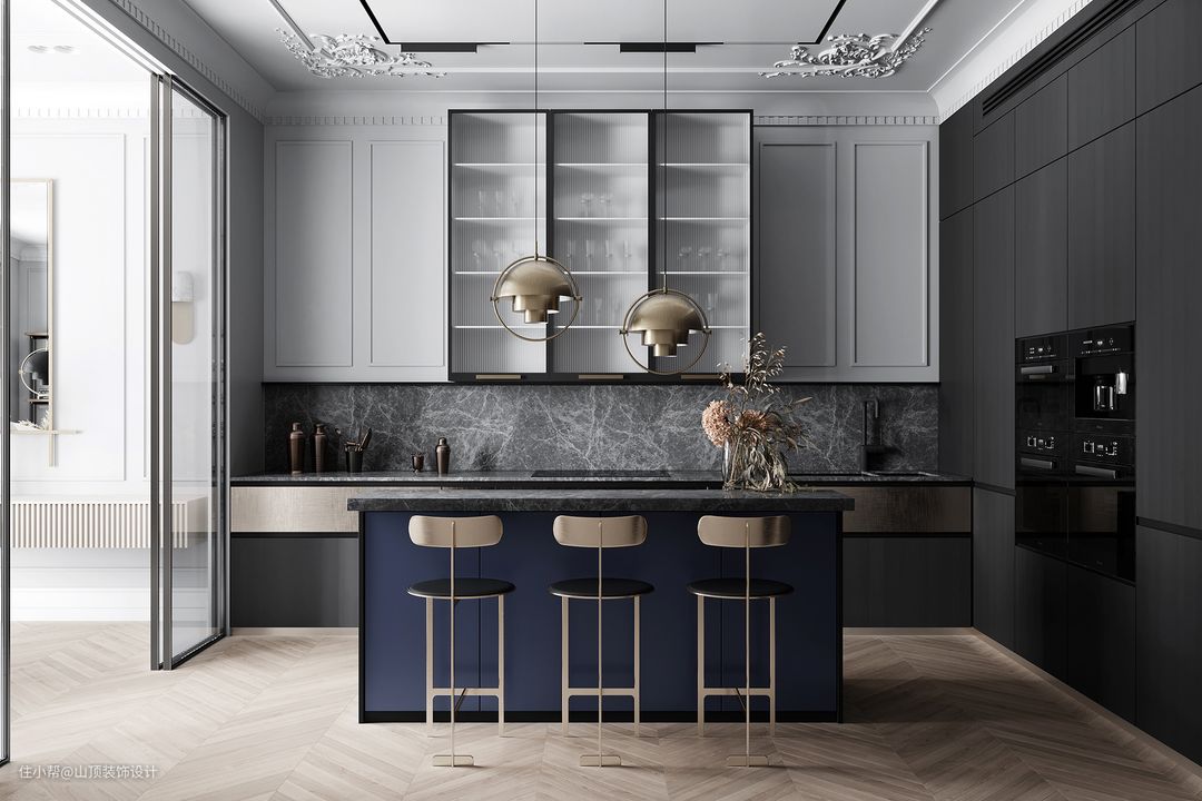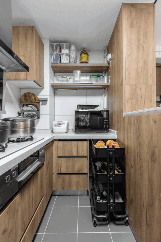 为避免妨碍日常操作,建议橱柜不要做满,然后将收纳架放到留出的空间里。这样设计,不仅厨房的动线更流畅,整个空间也显得更加整洁有序。