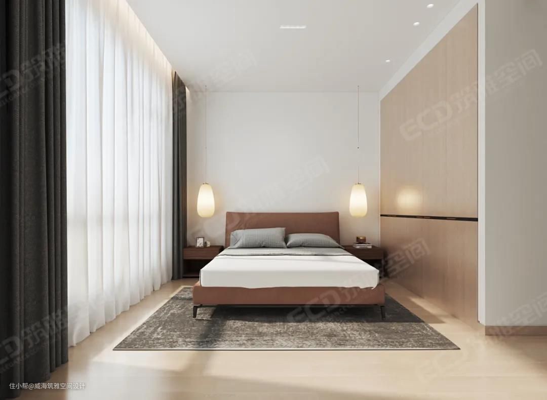次卧的床头灯设计匠心独具,静谧中营造出高级质感的生活品味,清晨被一抹阳光温柔的唤醒,夜晚看着满天繁星安然入睡,一切都是刚刚好的温柔。