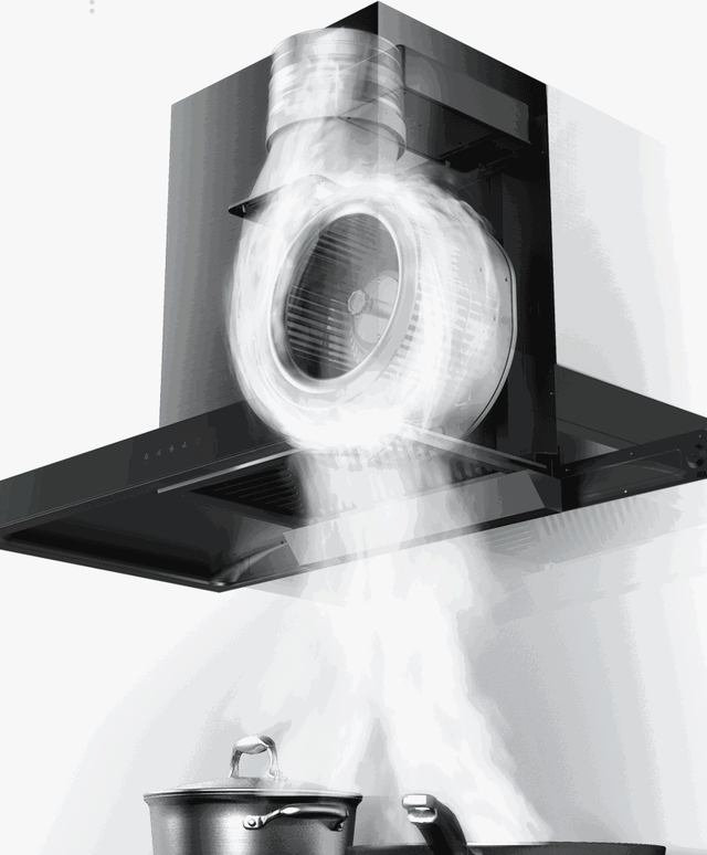 然后让叶轮旋转起来,把油脂甩出去——甩不出去怎么办?别怕,带这种功能的油烟机,叶轮可以双向转动。在顺时针转动几秒钟以后,会立刻停止,然后朝反方向转动。利用这种高速的离心力,增加把油脂甩走的几率。