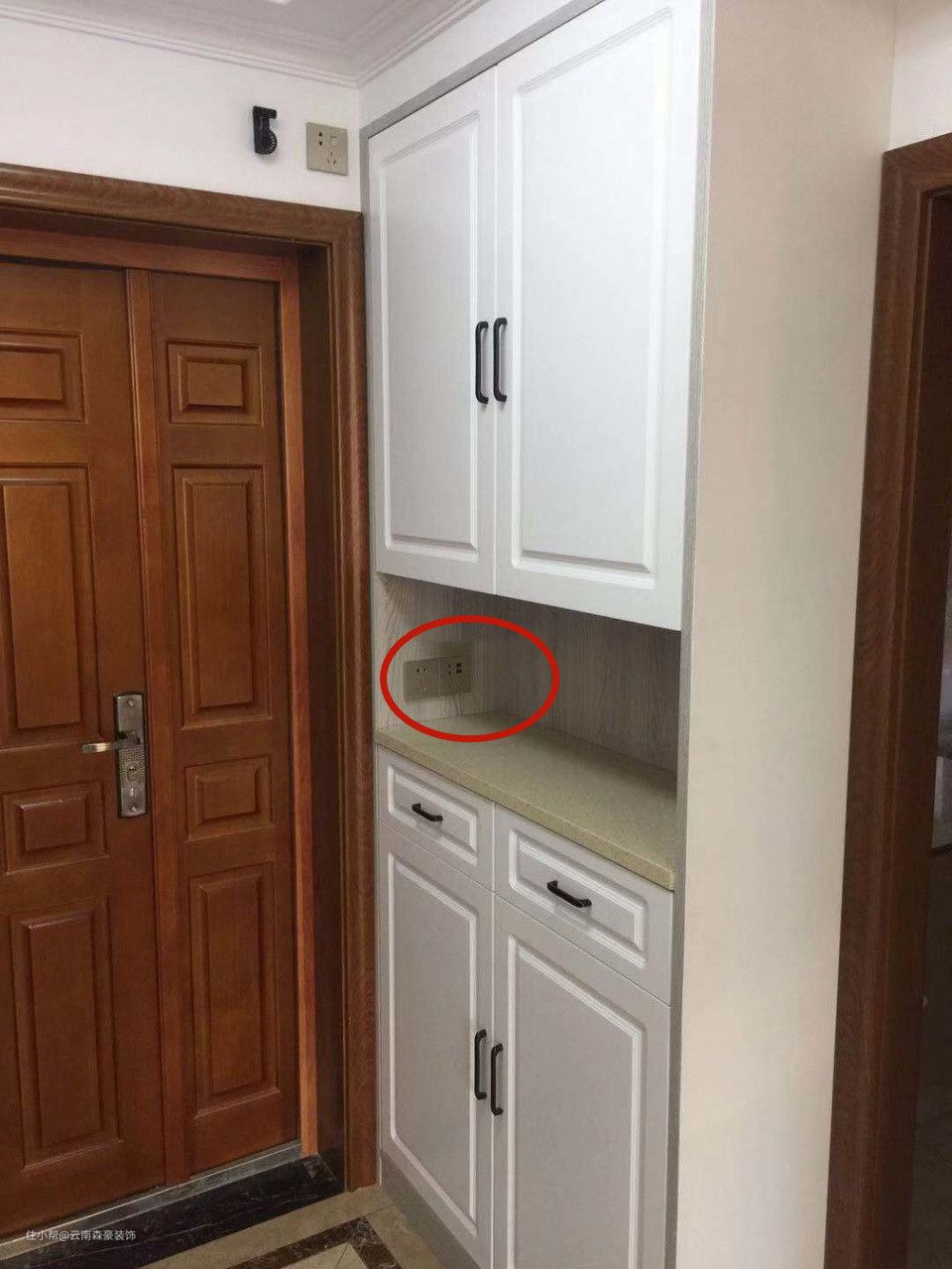 3、借着收纳的热度,流行顶天立地柜,玄关柜做成上下分隔的,中间有个小台面,这里可以设置一个五孔插座,可以用来: