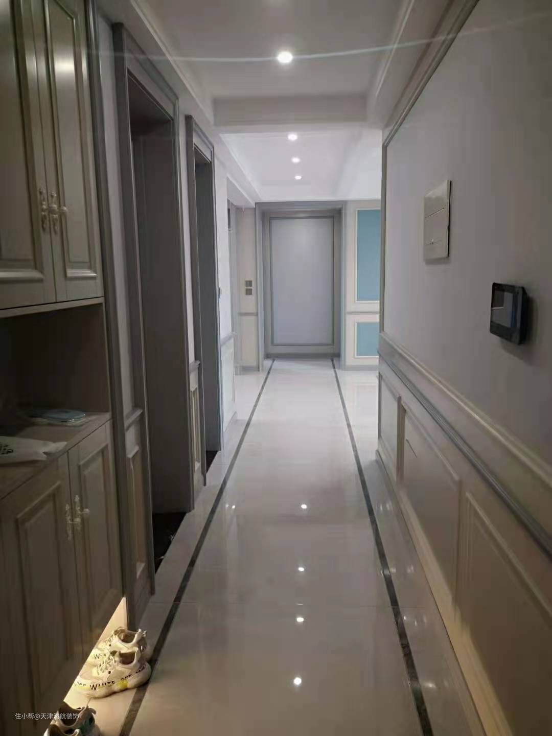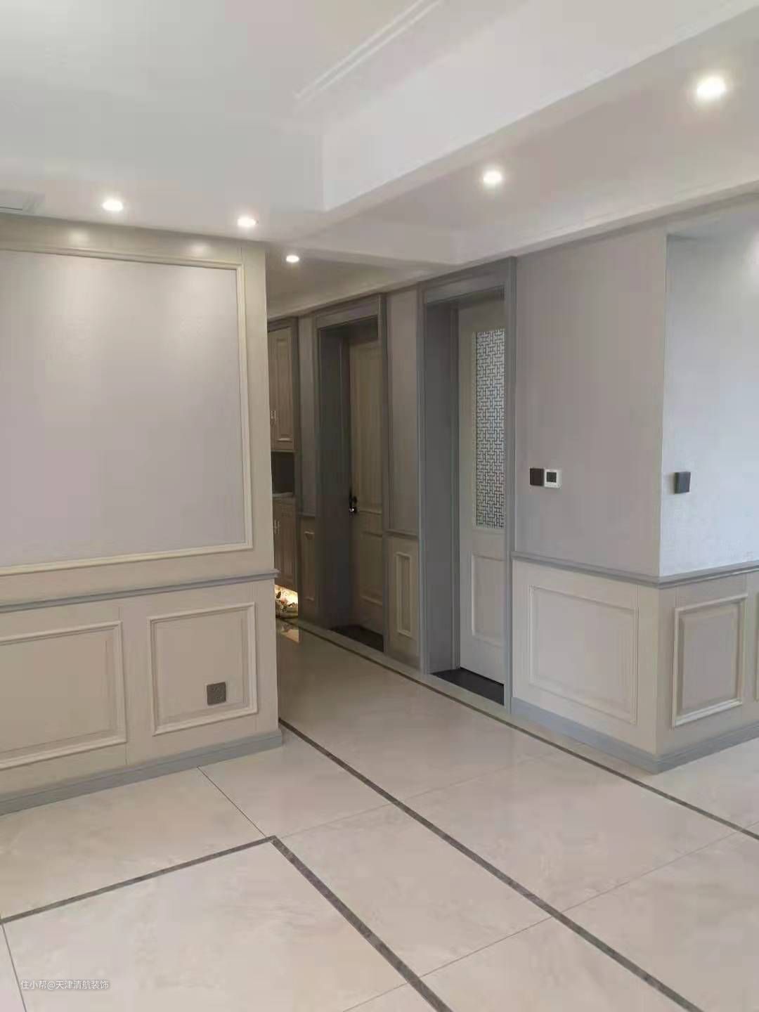 过道上上的护墙板给整个空间增添了一笔色彩,让整个空间衔接起来,简约但是不简 单,门口的颜色与踢脚线相搭配,比较美观,而且很有空间感,更显档次
