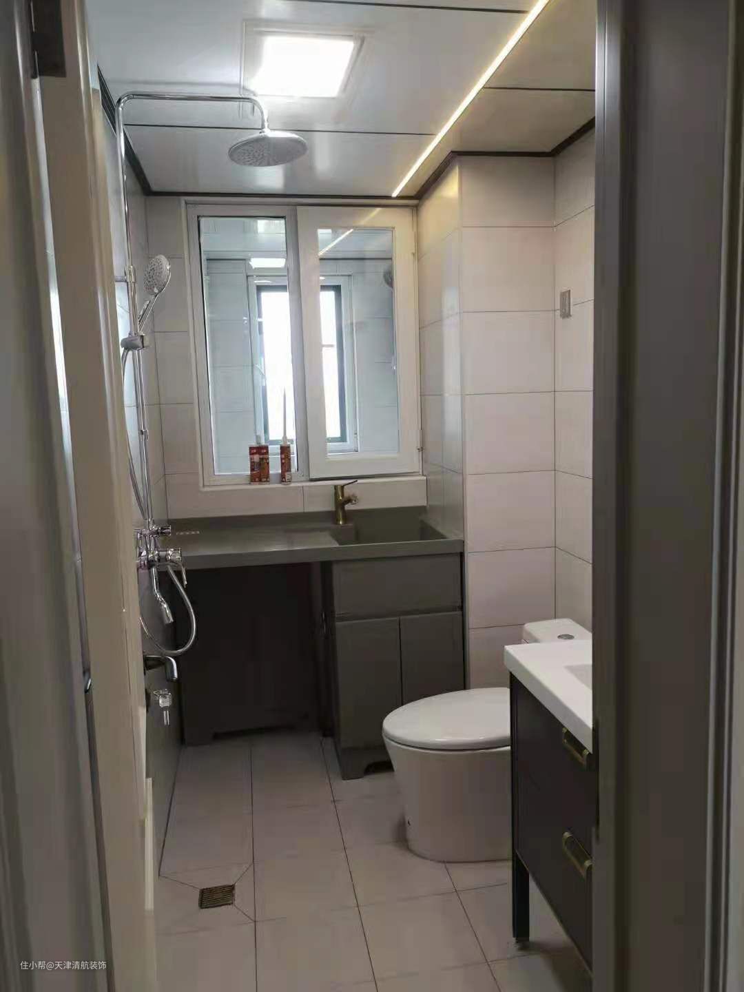卫生间,没有选择做干湿分离,因为卫生间面积比较小,如果做了干湿分离的话,会显得整个空间非常拥挤,我们视线正对面是一个专门洗衣服的池子,下面是放洗衣机的地方,这样节省空间还实用