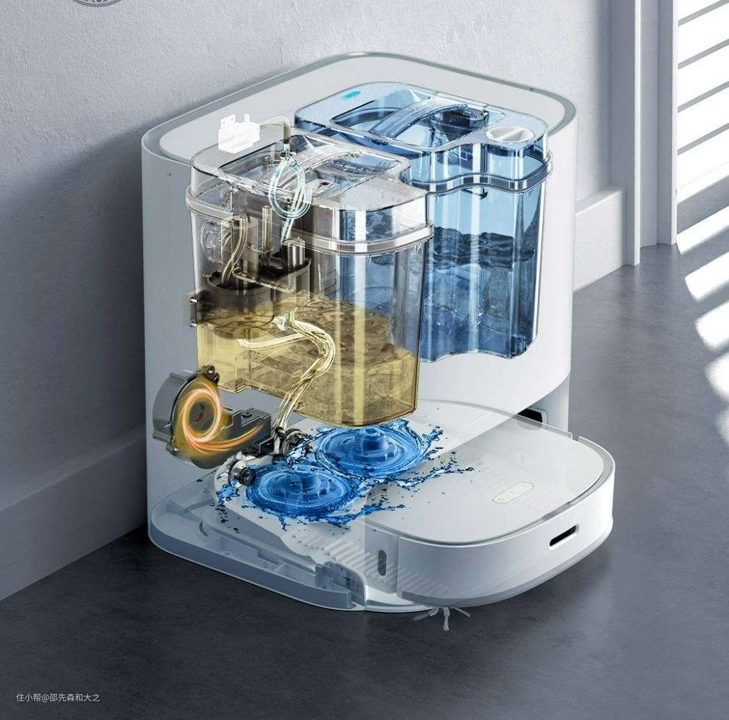 大概就是这个箱子,侧面看上去平平无奇,却内有乾坤,清洁坞提供了包括清洗拖布,上下水,烘干,充电等功能。