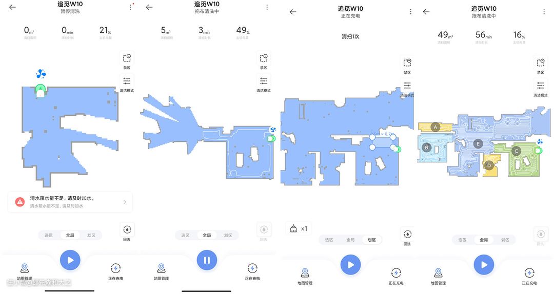 在清扫中,追觅W10采用了先划区,再描边,后S型清扫的模式,这也是大部分的现在的机器人采用的模式,而W10更是支持断点续扫的功能。