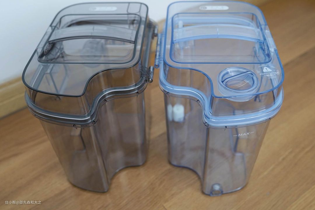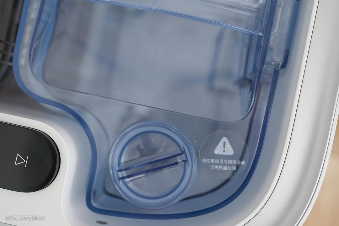 打开清洗坞的顶部,就可以看到清水箱和污水箱,各为4L,清水箱上标注需要加入追觅专用清洁液。