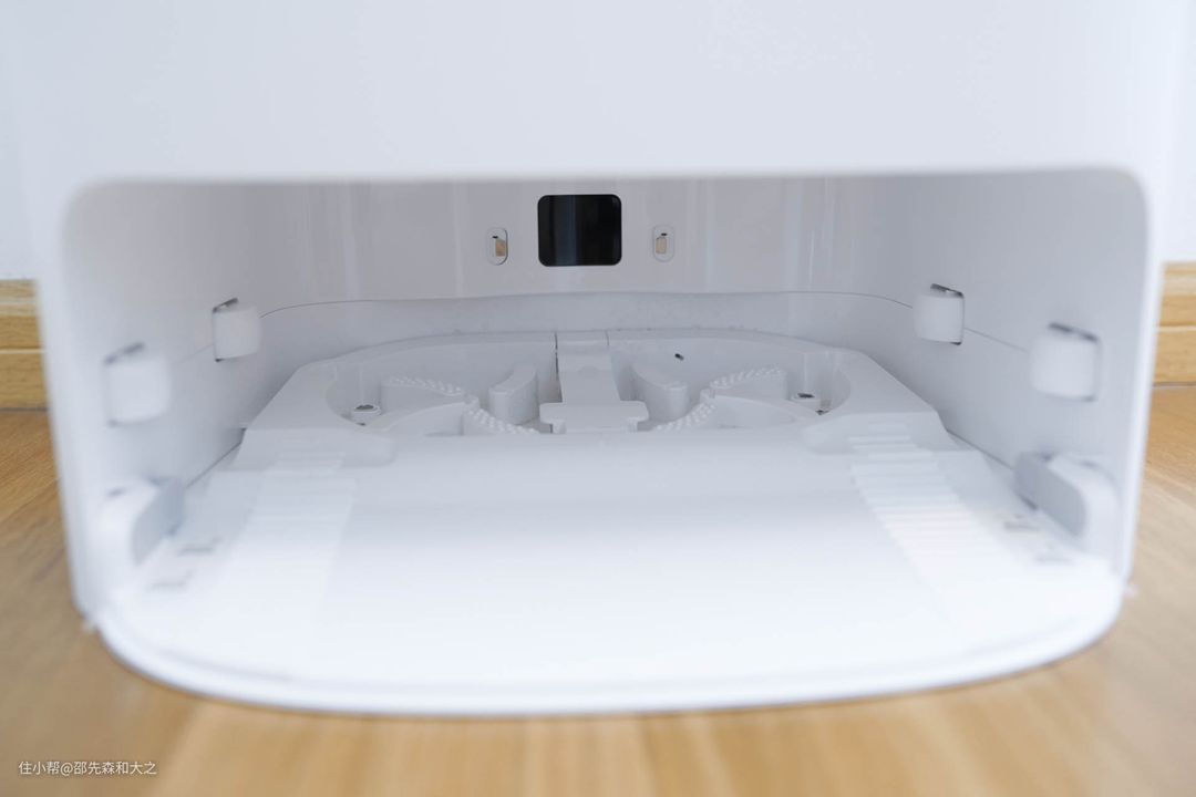 掀开上盖,可以看到尘盒,别忘了,这可是个正儿八经的拖扫一体机器人,4000pa的吸力,19.2cm的吸入口,450ml的大尘盒一样都没落下。