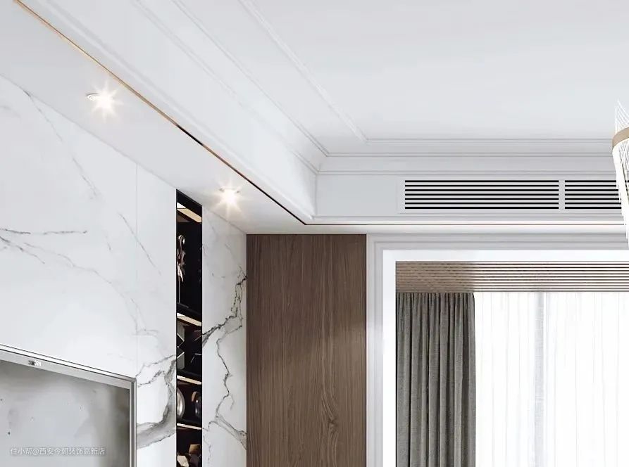 对于2.6m、2.8m这种户层较低的业主来说,双眼皮吊顶简直就是福音,通常设置吊顶,对层高尺度都会有一定的影响有的甚至会压低层高,使空间看上去很狭小,但是双眼皮吊顶沿着墙边绕一圈做造型,对于层高几乎没有任何影响。