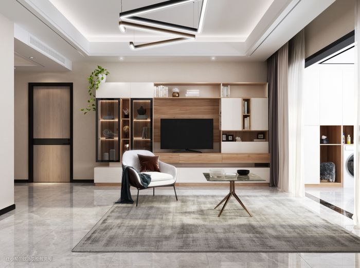 底柜+立柜+吊柜构成的回字形布局电视柜,这种设计一定程度地放大了空间的收纳能力,同时也让空间更加整齐规律、干净利落,打造错落有致的视觉效果。