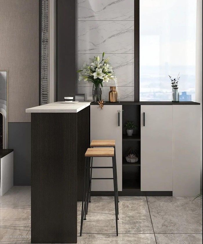 吧台隔断其实是比较时髦的一种隔断设计,这种小而美的家具有一物多用的好处。台面可以品茶、办公,下方可以作为收纳区域,最大的好处就是不遮挡光线。
