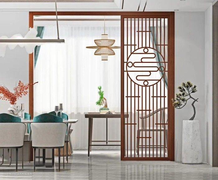 在入户or客餐厅之间想做隔断,可以利用雕花板或者屏风,一来分割空间布局,二来也能美化空间,略带古风的设计和新中式风格会更搭哦。