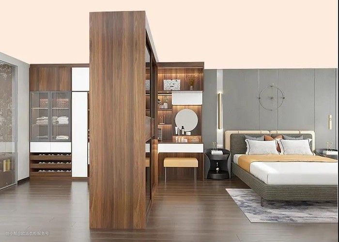 想要在卧室设置其他分区,还可以用储物柜隔断,例如衣柜、书柜等等。以柜作墙,柜体的另一边就是另外一方世界。