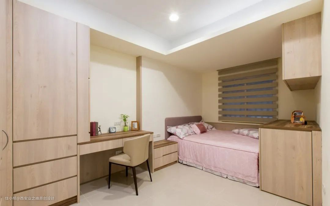 儿童房为两个女儿同住,将入门廊道设计成衣柜;两张床中间有柱子,因此在床头设计上掀式棉被柜,增加收纳空间。