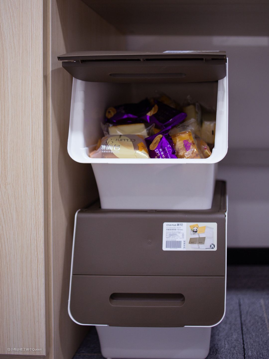 有吃零食习惯的小仙女,不妨利用我们书桌下腿跟柜板之间的夹缝空间开收纳。用一个懒人收纳箱(前开口收纳箱)做收纳,不需要太多整理技巧,直接将每次新购入的零食投入随意收纳就好。