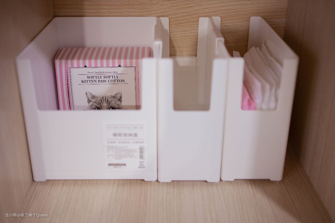用收纳盒将层板区做出分区,然后再将瓶瓶罐罐按照瓶子或者使用顺序在盒子里进行分区收纳,这样不仅可以把层板从前往后的空间都全方位利用起来,而且还能保证使用过程中避免不小心碰倒摔碎瓶子的风险。