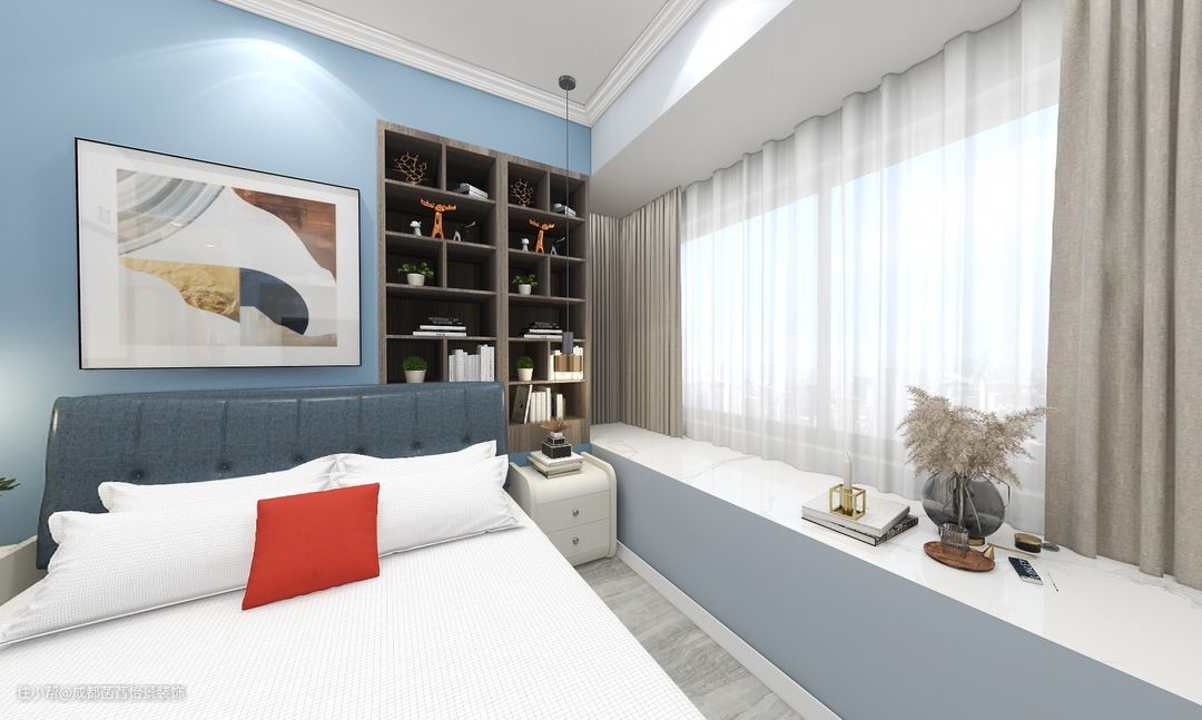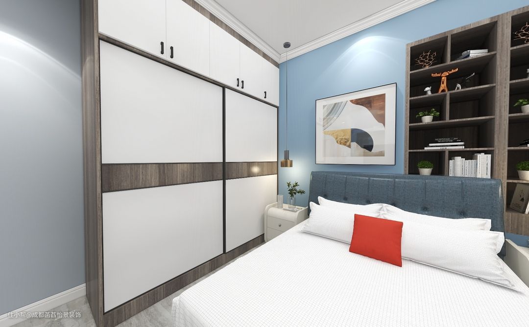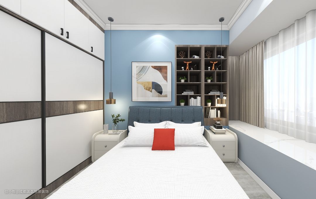 主卧利用开放式置物架作为床头墙,搭配蓝色的床铺、布置白色床单,精致清爽的空间,显得更加舒适时尚自然。