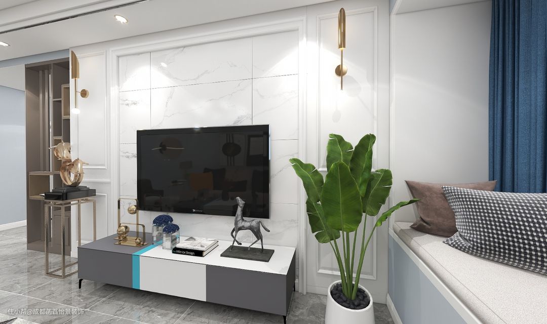 电视墙简约设计,靠窗区域布置一盆大型绿植、另一侧一个简雅的装饰,也带来一种简约舒适的优雅与舒适感。