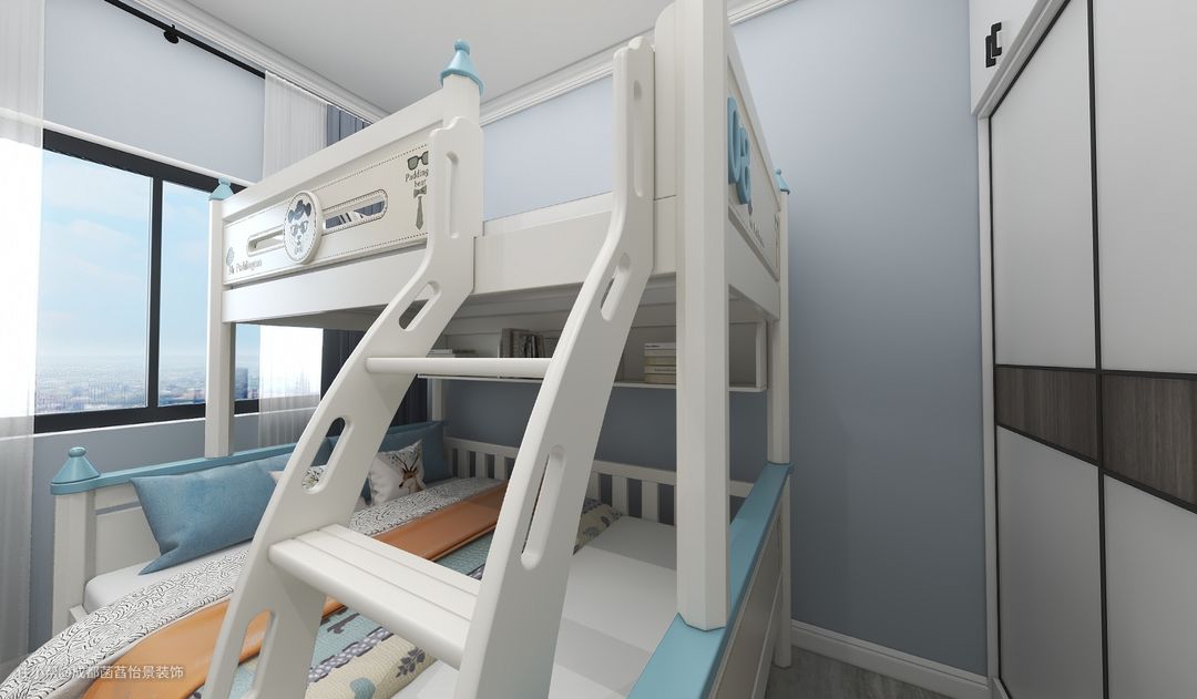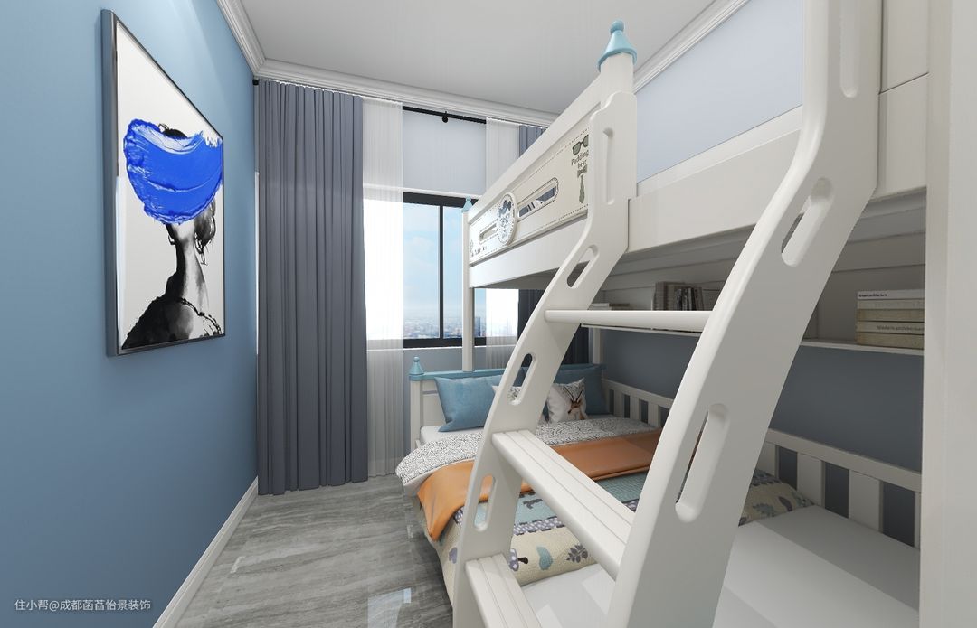 儿童房也是蓝色系,上下铺的设计,为孩子提供了玩耍与睡觉的位置,也让大人可以坐在这里照料孩子。