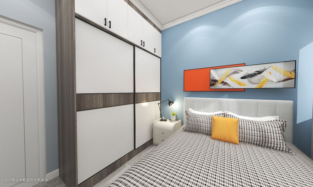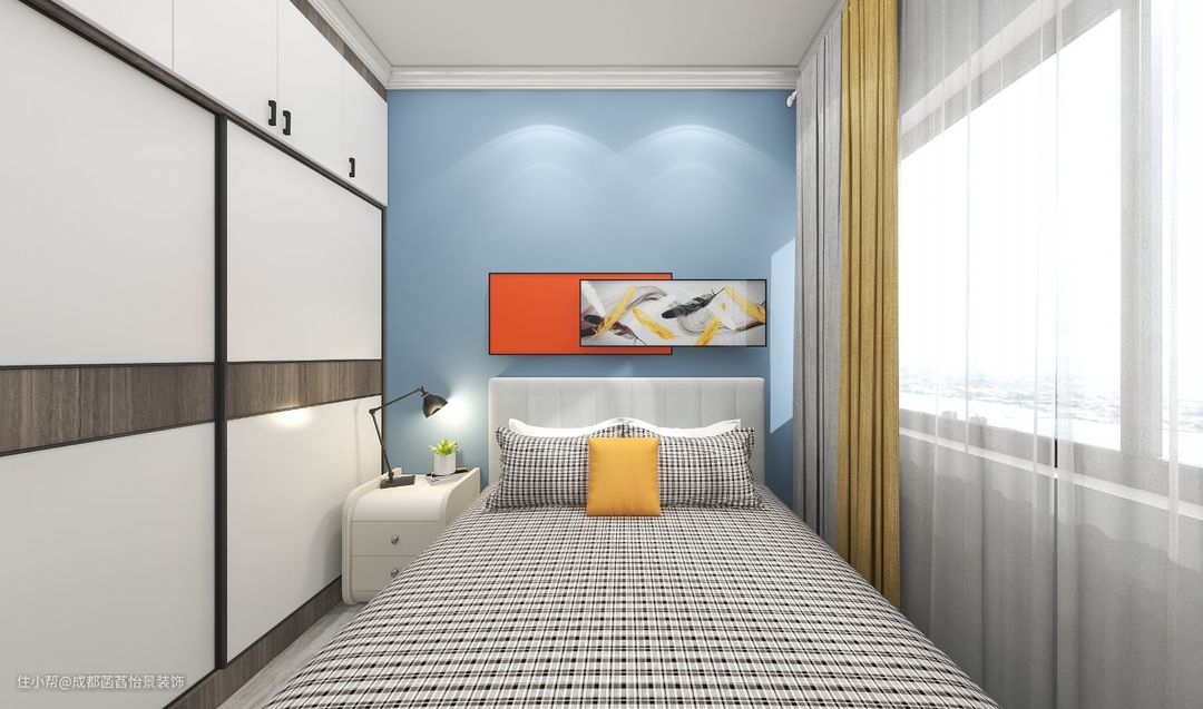 次卧延续了主卧的背景墙色调,软包的灰色床,还有灰色+黄色拼接的窗帘,并在床头加入亮色的装饰画,整个卧室充满简约的舒适氛围。