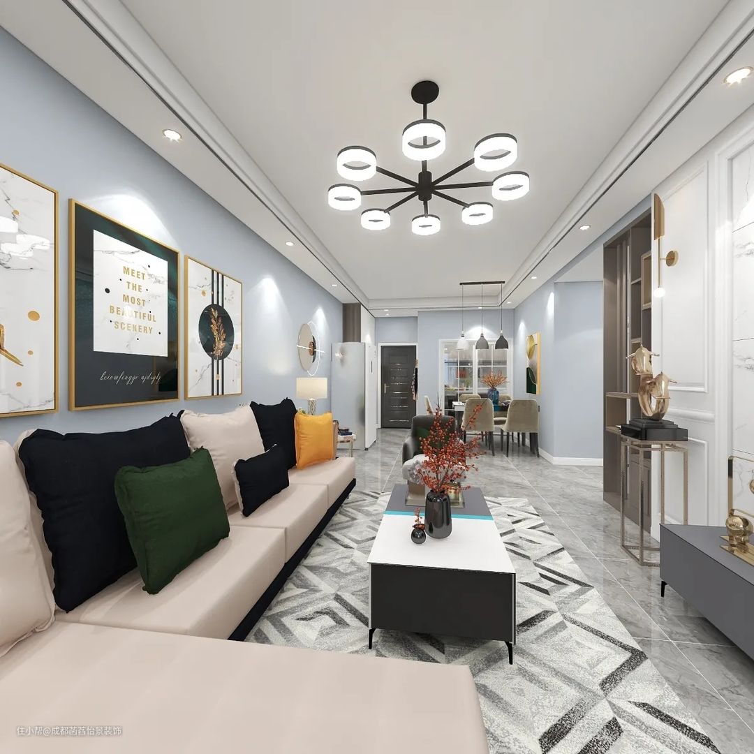 灰色地毯上摆上纯色布艺沙发,客厅中间布置一张岩板台面的极简茶几,整个空间都充满简洁优雅的大方与舒适档次。