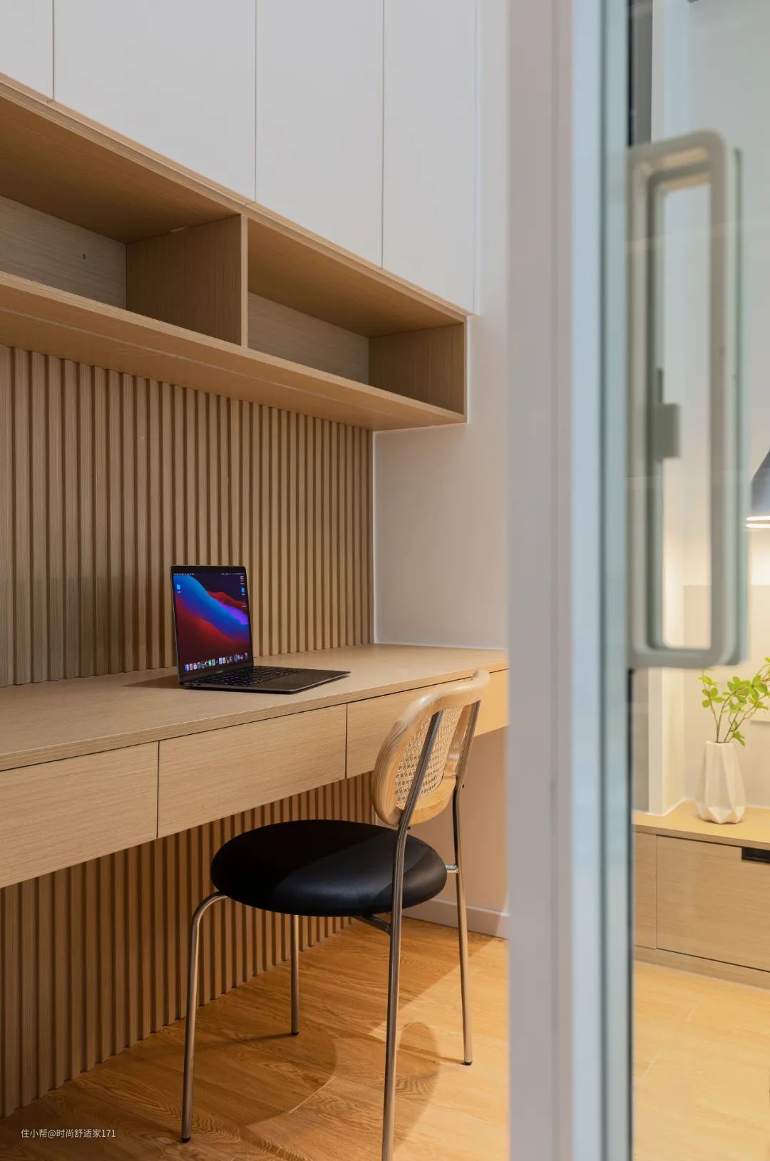 ▲主卧与客厅之间安装半开放玻璃窗隔断,既有效地划分空间,还不影响整体采光。内部定制了榻榻米+书桌的组合,满足了居住、收纳、办公等需求,大大提高了空间利用率。