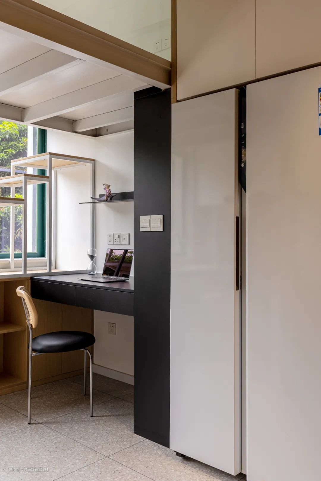 ▲厨房对面,打造了黑色搁板书桌+书柜的组合,作为小书房使用,满足在家办公的需求。
