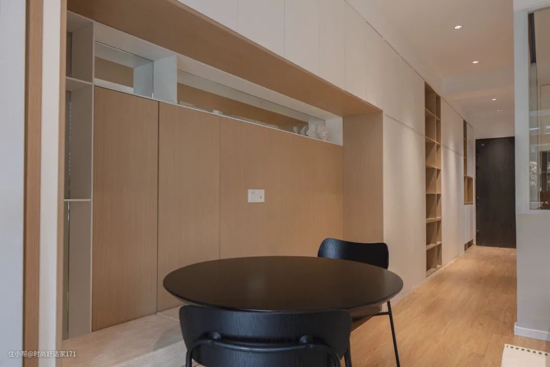 ▲狭长的走廊空间,一侧墙面定制了顶天立地的衣柜,作为步入式衣帽间,作为家里的收纳担当。