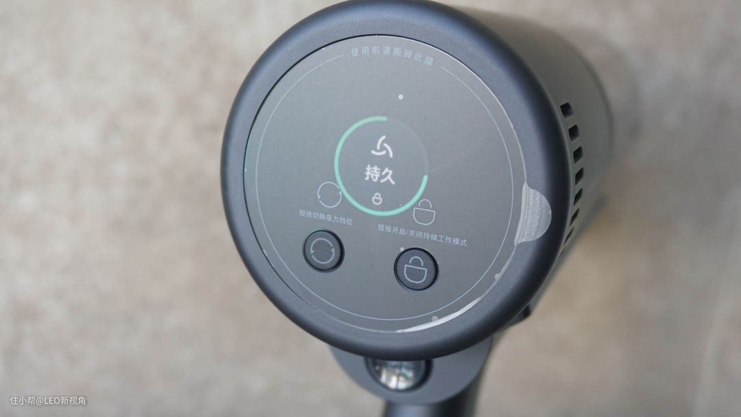 而在尾部,则是一块显示屏,可以显示当前电量、模式,另外还有两个实体按键,分别是吸力切换键和持续工作模式的开关键,如果需要持续工作,按下后就不用一直按着前端的按键了。操作基本单手就可以完成,还是比较方便的。