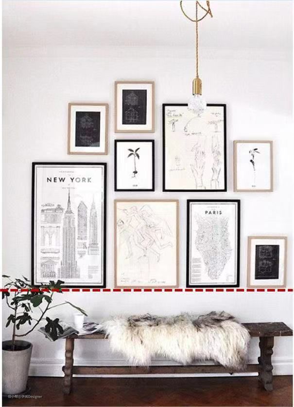 下水平线平齐的做法,随意感较强,照片主题最好一致,并采用统一样式和颜色的画框,整体装饰效果较好