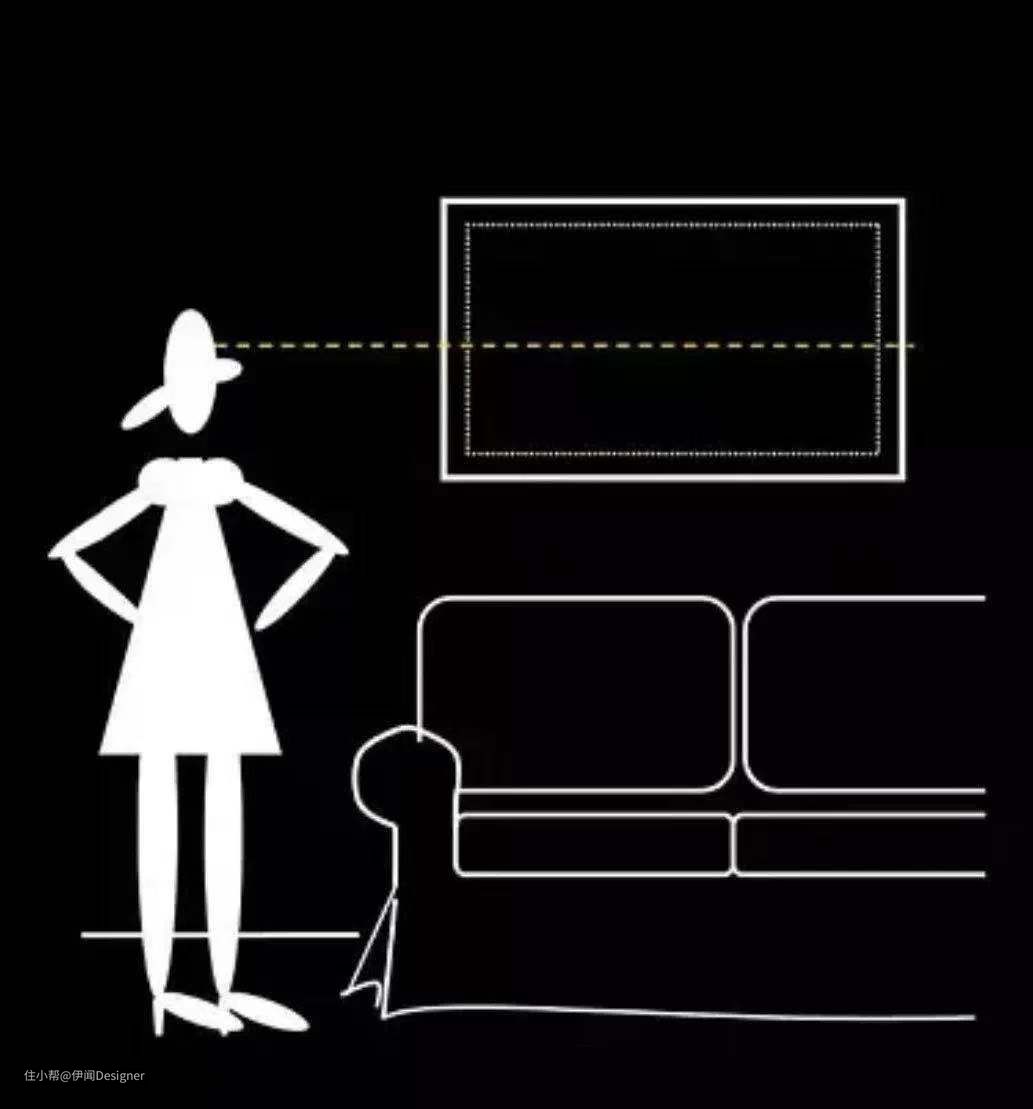 挂画的中心点略高于人平视的视平线(大白话说,人稍微抬一点下巴看到挂画、欣赏挂画)