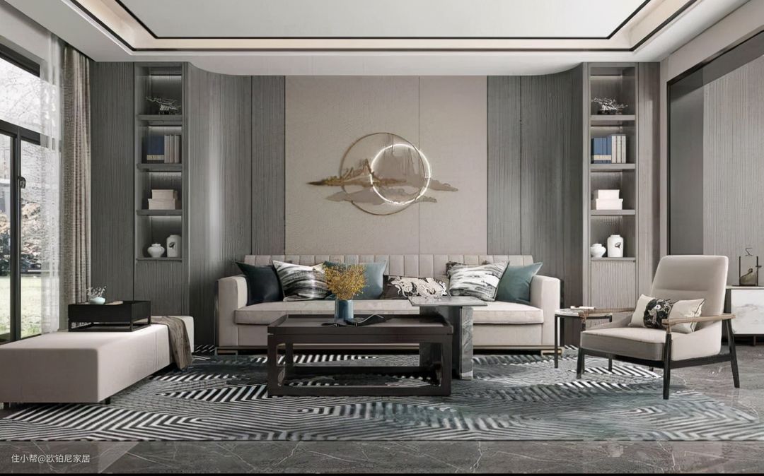 颜色素净淡雅,重在墙板与墙柜自然衔接的弧形设计,让墙板的视觉层次更加丰富和家装的整体感更强。同时,在搭配精致的浮雕图案,并辅以圆环灯光的点缀,令人眼前一亮,使得墙柜精美又别致,为家装增添了不少贵气。