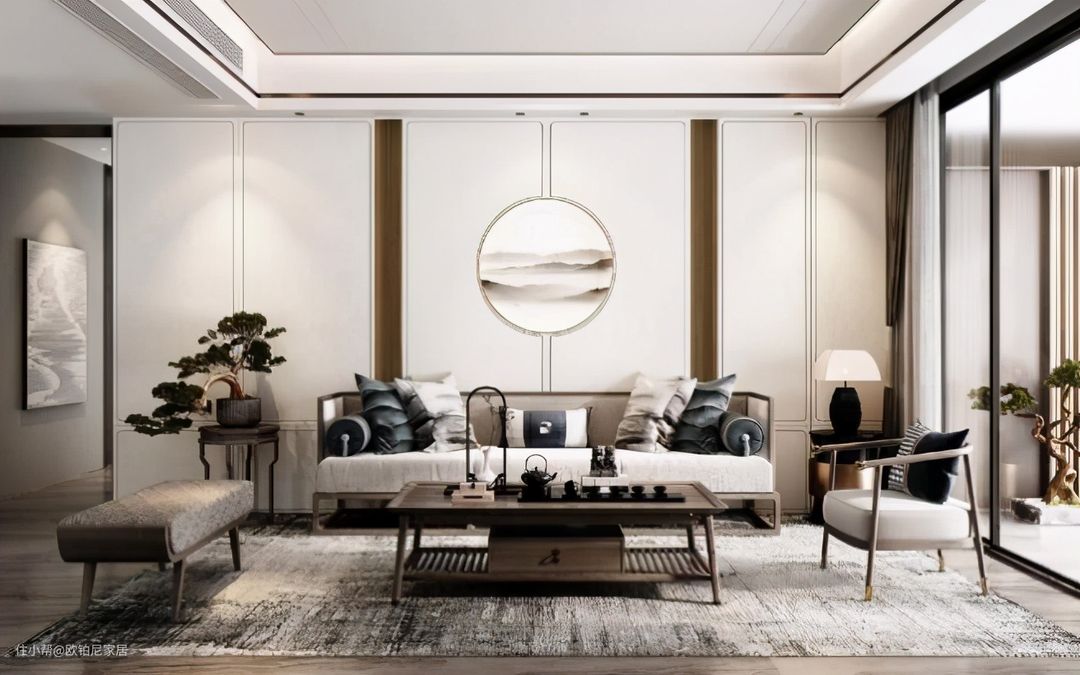 竖型纹理的均匀分布使得墙板好似古代的屏风,再另在正中央配上一幅中式水墨画,中式雅韵浓郁。简约的设计与中式特色相结合,正是当下正流行的新中式风格,清新婉约、新颖独特。同时,墙板大面积的白色在灯光下的作用下,还使得室内更亮堂了。