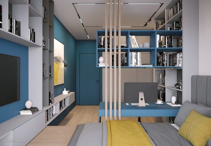 可以用衣柜隔出一个小书房,背面做书柜,靠墙做书桌。