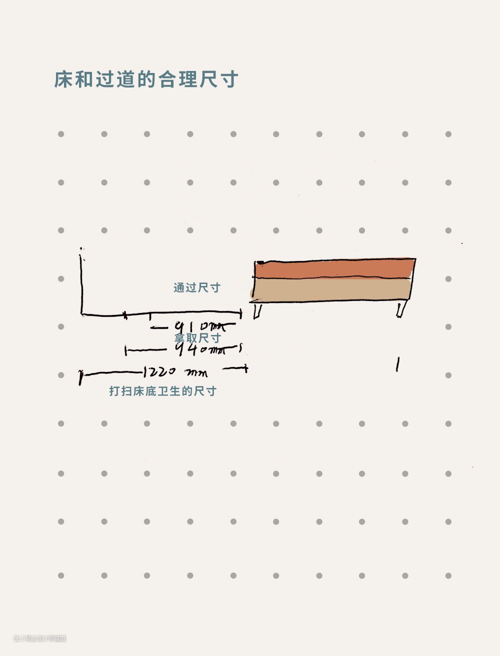 ③ 卧室过道尺寸是910mm,这个尺寸通过性比较好。床边如果方拿取东西最小尺寸940mm,比如床底有收纳空间。如果要打扫床底卫生,最小尺寸1220mm,方便屋主在打扫床底的时候,身体蹲下来打扫,因为要考虑到工具和人的空间。