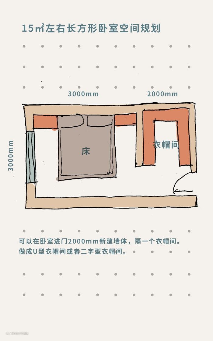 可以在卧室进门2000mm新建墙体,隔一个衣帽间,做成U型衣帽间或者二字型衣帽间。