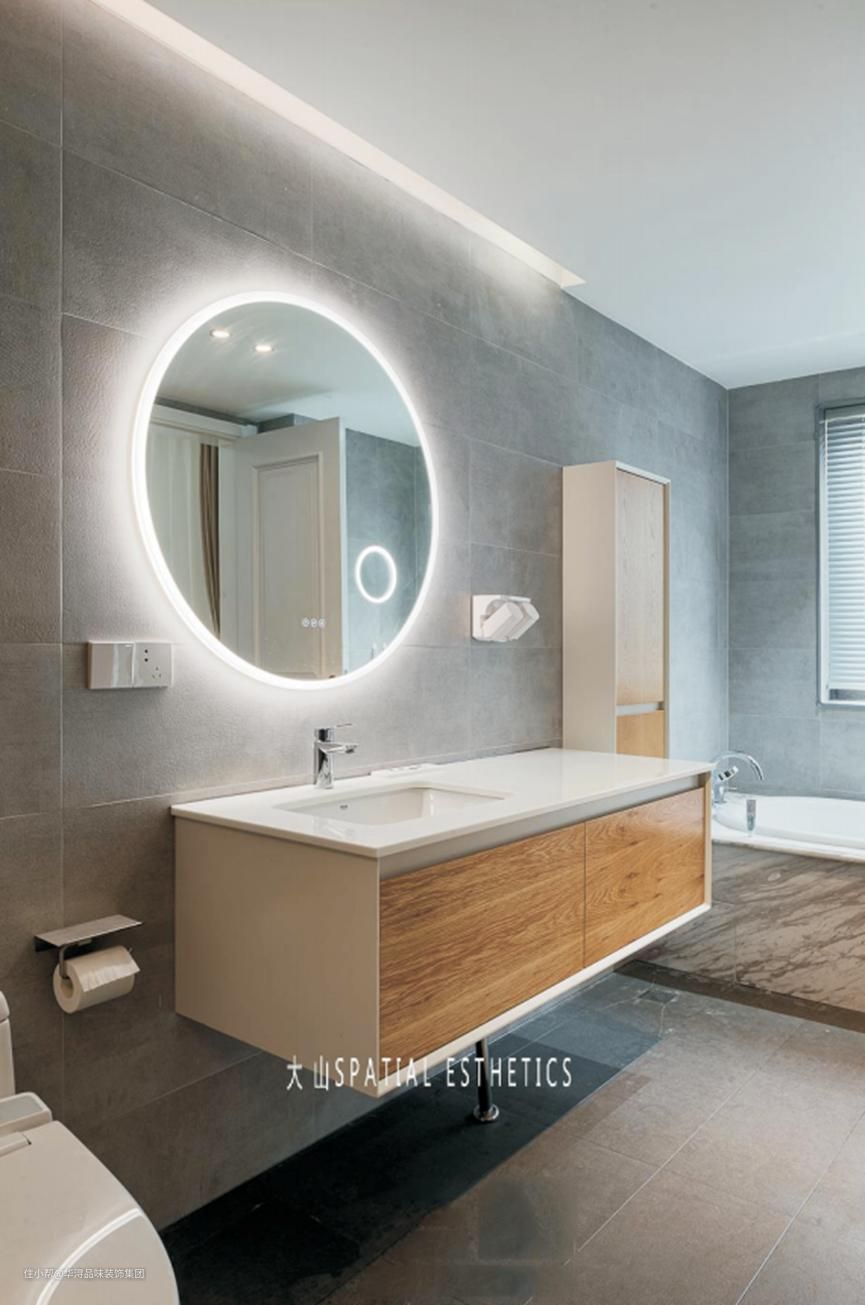 洗手区与如厕淋浴区分两侧布局后,再通过玻璃门进行功能区隔断,做好干湿分离的设计,而考虑到业主夫妇平时上班匆忙,时间宝贵,因此洗手区设置双人盥洗台,既满足夫妻两人早上同时洗漱,节省时间的需求,下方留空区域,在方便打扫的同时,还提供了更多的收纳空间,实用性一绝!