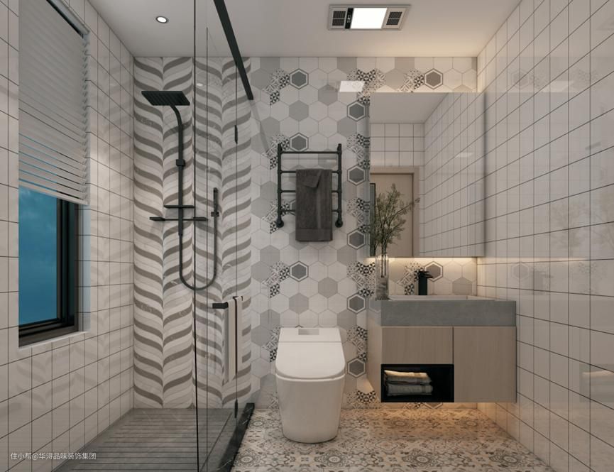 第二套案例设计是整套房子中的公卫,选用六边形和柳叶形的拼接瓷砖和白色花纹地砖,色彩间的搭配使得整个空间看起来更加的灵动舒服,镜柜在主体空间中起主要的收纳作用,下方留空,也方便日后的清洁与打扫。