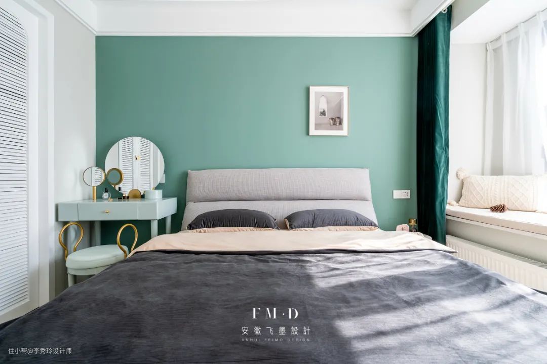 自带飘窗的卧室,可打掉飘窗或借助飘窗位置设计一个梳妆台,靠窗的位置最适合化妆了。