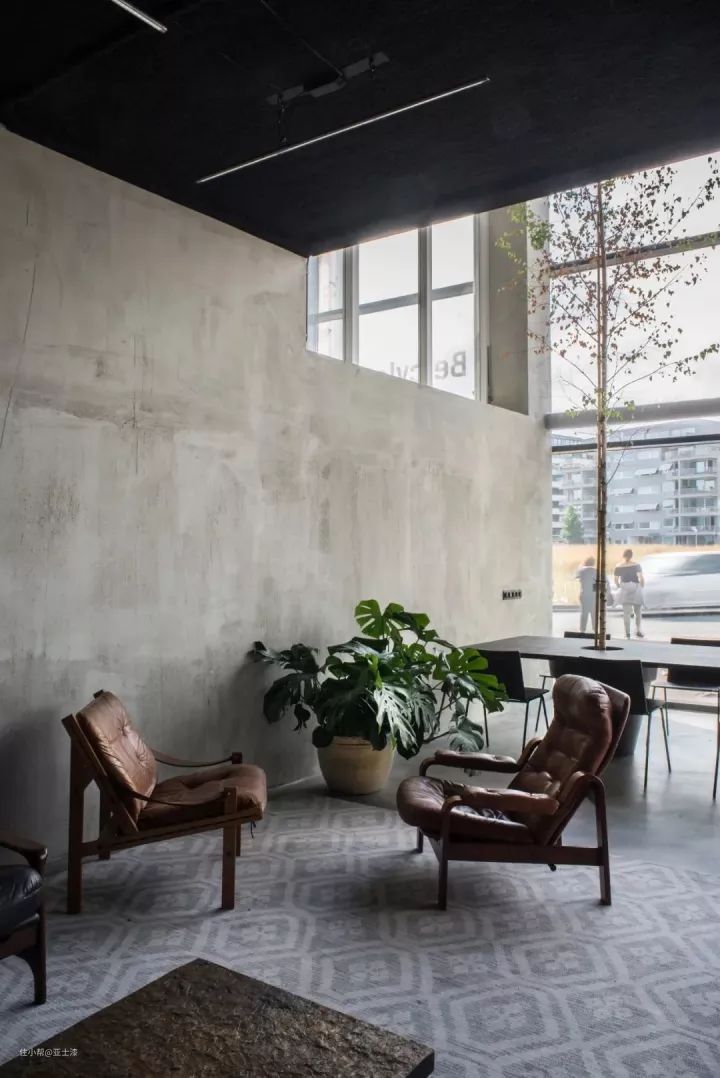 咖啡厅以黑色为主,水泥地面和粗糙的墙面凸显硬朗的工业风,几株绿植为空间增添了生命力。不同材质的沙发座椅给人不同感受,有助于顾客放松的享受休闲时光。