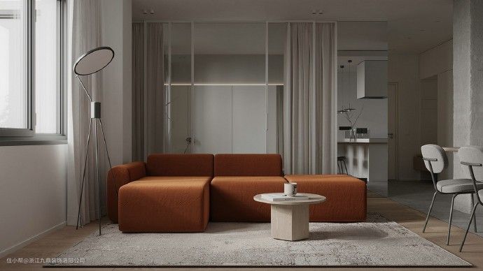 沙发的颜色是一大亮点,脏橘色既不会太突兀,同时给空间也增加了色彩,空间层次更丰富,搭配浅灰的地毯和简约的小茶几,干净大方。