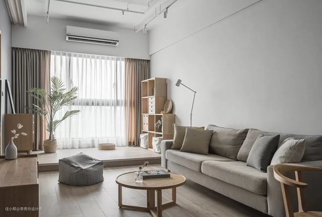 客厅面积足够干嘛不在靠窗的位置设计一个地台,通过抬高地面来划分空间增加层次,也得到一个休闲区。
