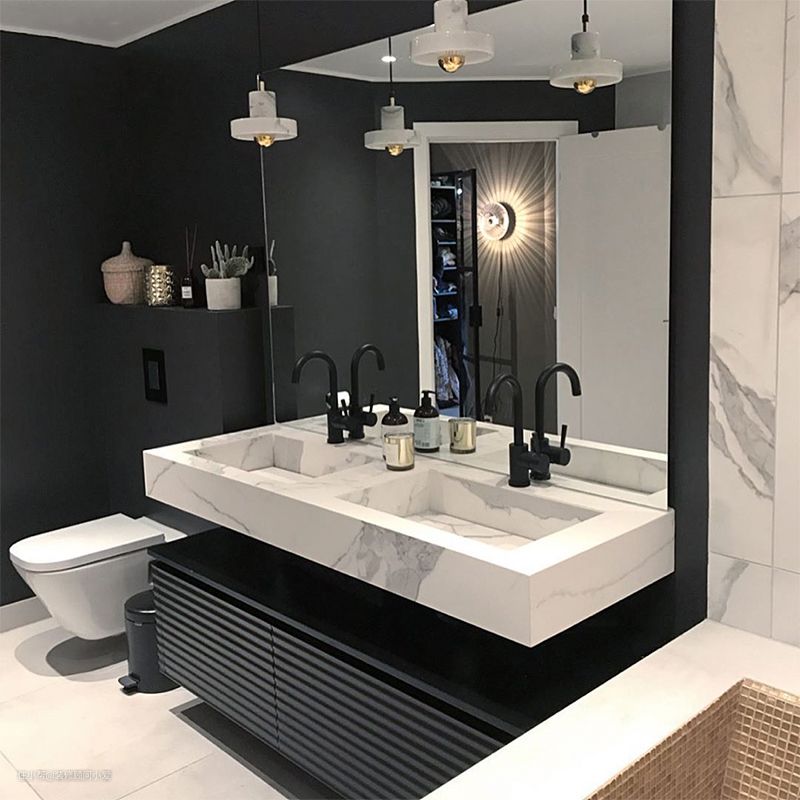 看浴室设计图,岩板一体盆颜值高,干净利落,轻奢范儿。从材质讲,岩板硬度高、耐磨、耐用持久。