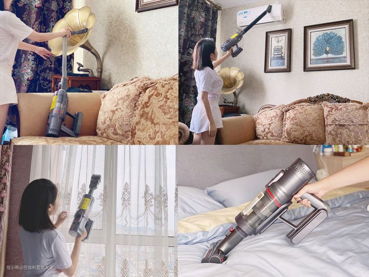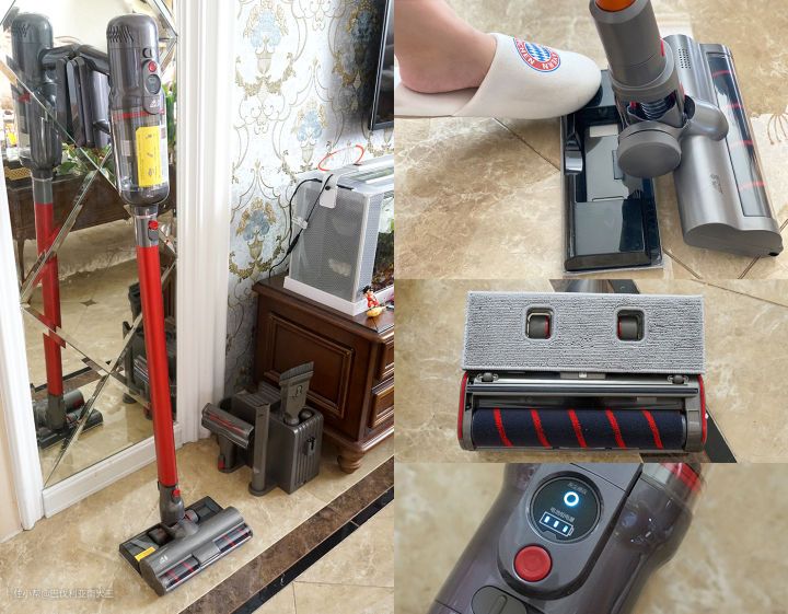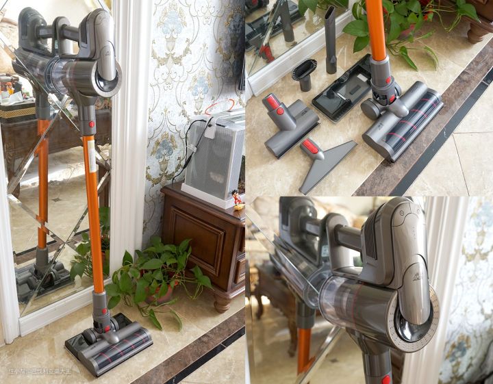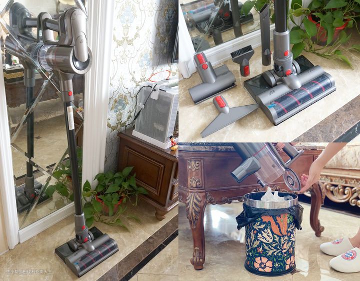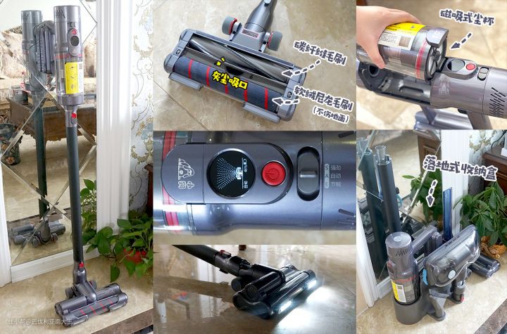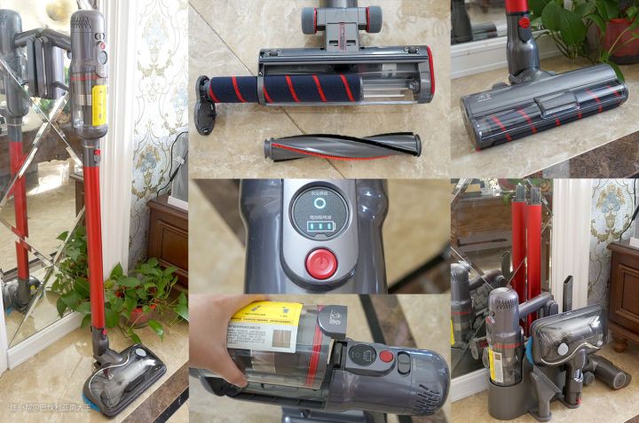 特色:配备的刷头及配件非常丰富,几乎满足了家里方方面面的清洁需求。还有落地式收纳盒,不用再给墙面打孔了!磁吸式尘杯,倾倒时灰尘不会到处飞,也不会弄脏手,细节好评!70分钟超长续航,大户型首选。