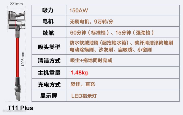 特色:湿拖一体,续航是T11系列里最长的,能达到60分钟,多了一个滚刷,方便清洁地毯,不缠毛发。