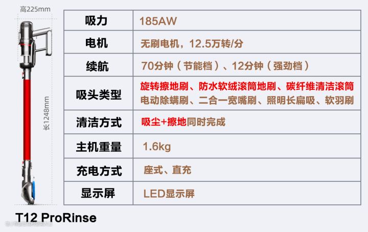 点评:次旗舰型号,185AW吸力、无刷电机、拖地模块、磁吸尘杯、续航等都和旗舰款T12 Storm Rinse一样,只是配件+显示屏不同。屏幕从OLED屏降为LED,双滚电动地刷从双滚筒降为单滚筒,影响不大。