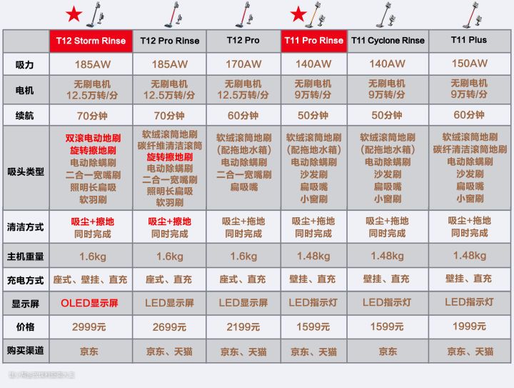 首先通过我整理的这张T12、T11型号详细对比图,可以看出小狗目前的吸尘器主要分为两大类:吸拖一体吸尘器和擦地吸尘器。