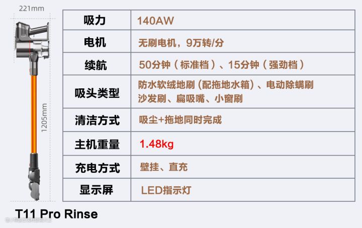 点评:小狗T11 Cyclone Rinse是我家用的第一款无线吸尘器,所有参数和T11 Pro Rinse一模一样,两者只是长杆的颜色不同,一个橙色一个黑色。