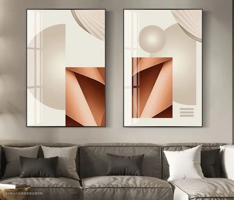 以沙发最中心为中心点,左右进行对称将挂画挂置在墙上,适用于单幅挂画和双数对称挂画。挂画最好是统一色调、同一系列的挂画,才能达到画面对称。