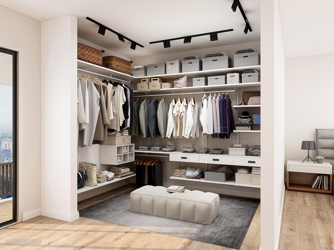 嵌入式衣帽间是利用房间的角落隔离出来衣帽间,空间利用率很高,有效防尘,保持整洁。