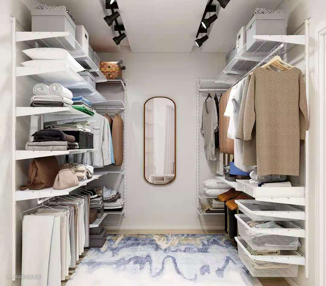 ⑥二字型金属衣帽间,如果你不想化妆间和衣帽间放在一起,可以在一面墙挂一个镜子,方便你穿搭。