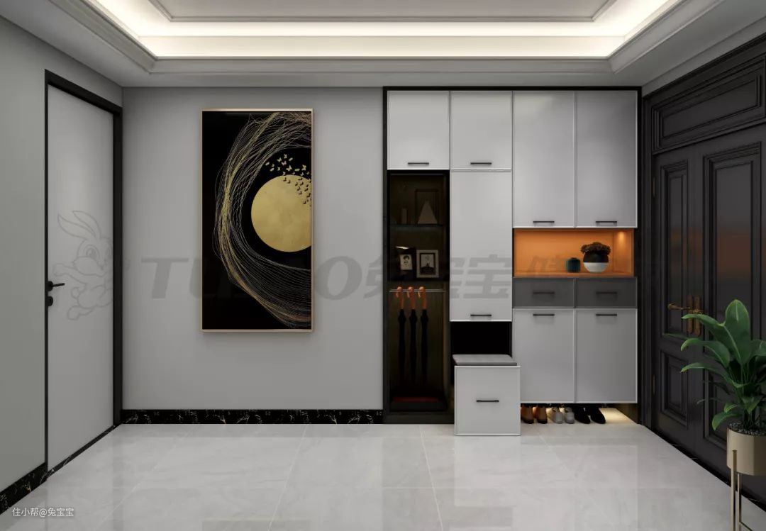 鞋柜设计有藏有露,同时满足储物和收纳展示功能。中部镂空的爱马仕橙跳色套格,为黑白灰的鞋柜带来活跃气息。
